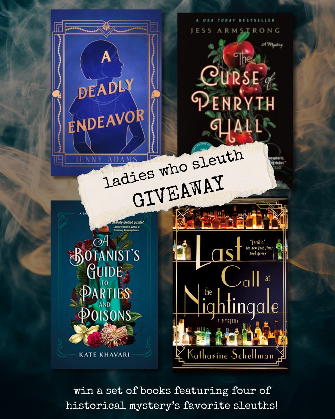 One lucky winner will receive a physical copy of my own A Deadly Endeavor, The Curse of Penryth Hall, by Jess Armstrong, A Botanist’s Guide to Parties and Poisons, by Kate Khavari, and Last Call at the Nightingale, by Katharine Schellman. Each book is the first in series.
